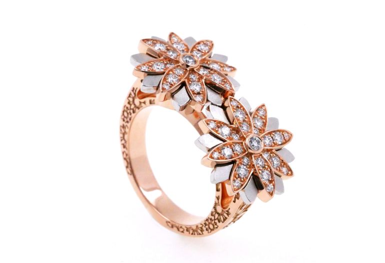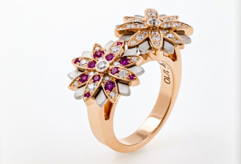 Ring in rose gold and platinum, featuring diamonds and rose sapphires.