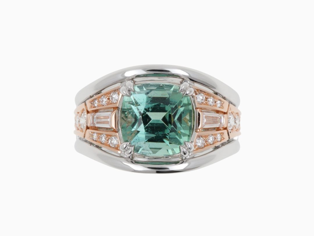 Bague bandeau bicolore sertie d'une tourmaline verte avec doubles griffes.